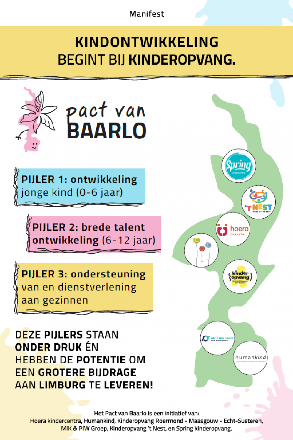 Daarom is er het Pact van Baarlo. Want investeren in de nieuwe generaties loont, via een samenwerking van Limburgse organisaties in de kinderopvang. Met één duidelijk verhaal: Kindontwikkeling begint bij kinderopvang.
